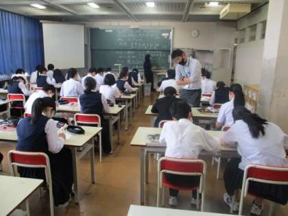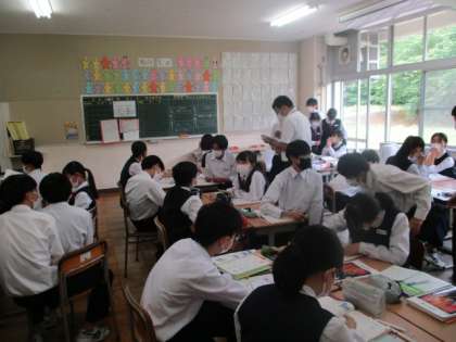1組は美術の授業、ランプシェードのデザインを考えています。担任の先生も参加しています。