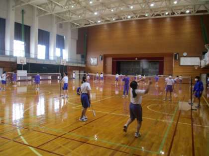 4組は体育の授業、バドミントンの試合を楽しんでいます。