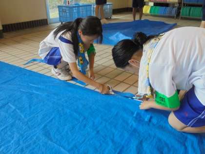 プールでシートの整備 蒸し暑い!