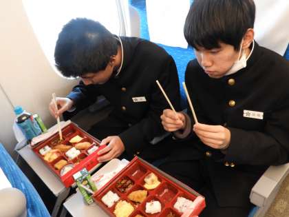 午前中はほとんどがバス・新幹線での移動です。車内では、休んで体力を温存したり、近くの友人と話をしたりしてゆったりと過ごしています。