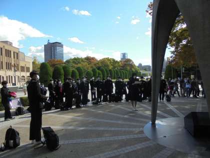 平和セレモニーとして、「原爆の子の像」の前で各クラスで作った千羽鶴の奉納や黙祷を行いました。