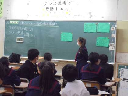 期末考査のための部活動停止期間まで1週間を切りました。学年をあげて学習に向けた雰囲気を作り上げたいところです。今日は5限までのスペシャルデー。総合的な学習の時間では「自分を見つめ、将来を想像する」のテーマで学習を進めています。将来の「働く」姿をイメージすることは、現在の知識を蓄えることにつながります。今日は「なぜ働くのか」を学級で考えました。