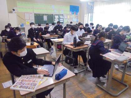 写真上:13H 家庭科 クロムブックを使って、郷土料理のレポート作成