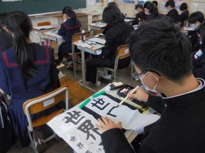 また、書き初めでは練習の成果を発揮すべく、丁寧な筆使いで太く大きな「世界平和」の字を書くことができました。