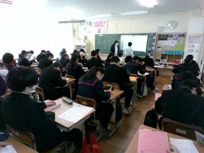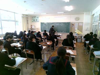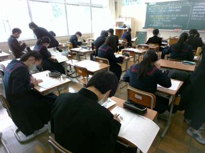3組は、社会の問題を各自で復習し、昨日の入試問題の答えを確認し合っています。(中)