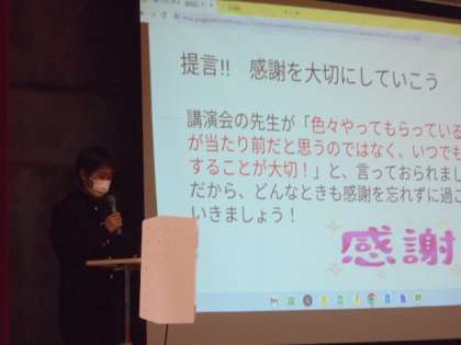 本日の総合では、以前実施した「働く人に学ぶ」講演会を振り返る学年集会を行いました。集会では、実行委員が事前に作成したスライドをもとに、講演を聞いて学んだことや、これから自分たちはどうしていくべきなのかについて発表しました。