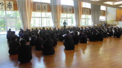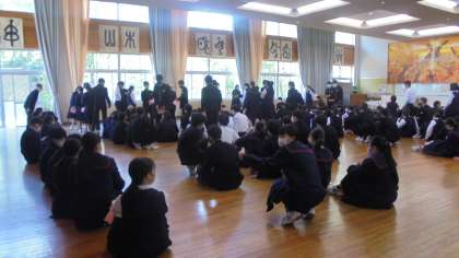 ランチルームにて、修学旅行の隊形練習をしました。縦長の隊形、横長の隊形、それと写真撮影の隊形です。班長・副班長は点呼、報告の練習も行いました。