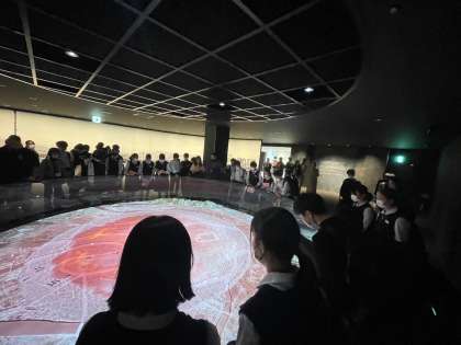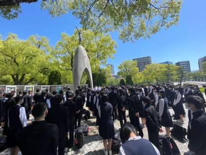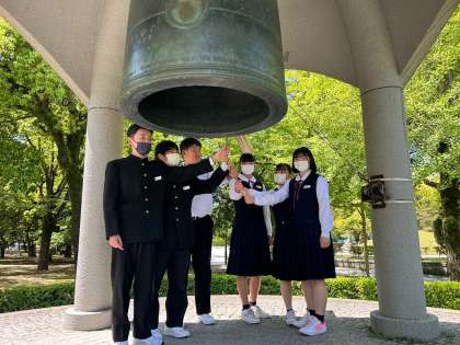 黙祷を捧げてから、平和の鐘をつきました。資料館では、集中して見入ってます。