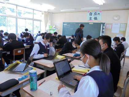 また、保健体育の授業では、タブレットPCを使い「自分に合った走り幅跳びの跳び方」を調べ考えました。次の実技の時間に活かされることでしょう。