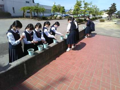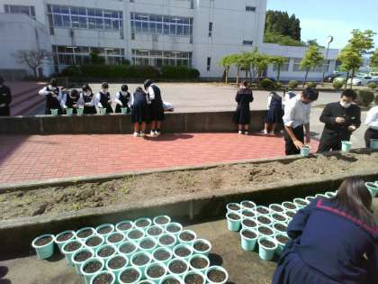 教室で作業内容を確認して、玄関ホールでミニニンジンの種まきを行いました。次の授業では、ミニトマトの芽出しを行い、植え付けします。
