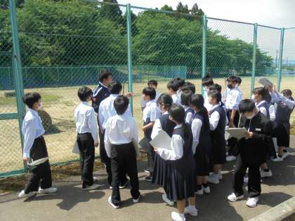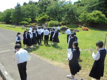お天気がよいため、1年2組の生徒が理科の授業で野外観察に出ていました。花や草、苔等を観察し、一生懸命に記録していました。