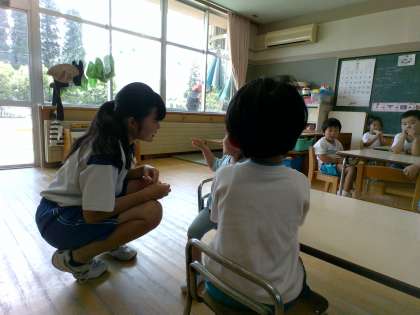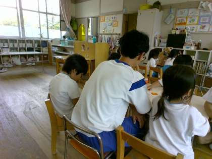 大沢野ちゅうおうこども園では、子供好きな4名が活動しています。午前の活動を終えて給食を待つ間、園児に絵本を読む姿が見られました。園児たちがもうすでに中学生になついており、この5日間が無事スタートできたことがうかがわれました。頑張れ!2年生。