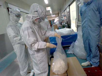 指導ボランティアの方から指導していただき、薬品の原料を開封しています。