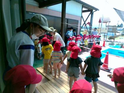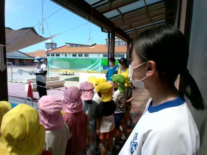 大久保認定こども園には6名の生徒が活動しています。本日はプール開きということで、未満児以外の園児と先生方でお祓いの儀式をしておられました。毎日暑いですが、中学生はがんばっていました。