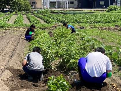 今日は午後から畑でじゃがいもの収穫を行いました。様々な種類のじゃがいもを皆手際よく掘り起こしていました。昨日はトマトを1200個収穫し、収穫したトマトは給食センターに運ばれていったそうです。生き生きと活動している姿が眩しく、輝いていました。