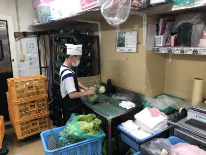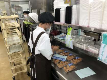 裏方作業で、レタスの袋詰めと揚げ物のパック詰め、シール貼りを行っています。