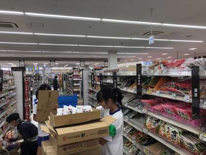 大阪屋ショップ キャロット1店では、2名の生徒が品出しに奮闘していました。活動も4日目を迎え、段ボールを開封して商品を陳列する姿は、手慣れたものでした。