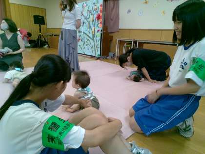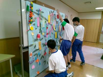 大沢野児童館でhは、5名の生徒が活動しています。乳児とそのお母さん方の交流会中でした。七夕の壁面に書いていただいた短冊を飾る手伝いもしていました。テキパキと動き、充実した表情が見られました。
