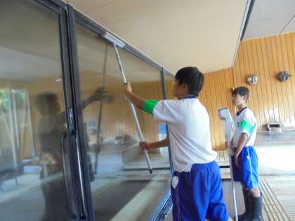 こちらでは2名の生徒が働いています。大浴場の清掃は、毎日のように行われているようです。この写真は、大浴場のガラス面の清掃を行っている様子です。今週一週間頑張ったことで、午後には入浴させていただけるということでした。本人たちは大喜びでした。