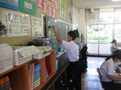 帰りの会で、クラスメイトに伝達内容を伝えています。