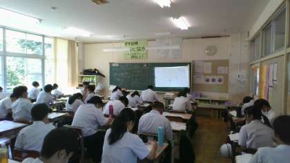 23Hはマス目のある黒板や投影機を使って、1次関数について学習しています。(写真上)