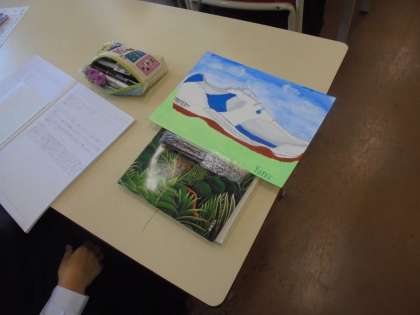 ポスターカラーを使い、全員無事、自分の内履きの絵が完成しました。今日は頑張った点や工夫した点、難しかった点などの感想を書いています。