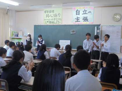 後期学級役員の紹介が行われていました。後期の学級関係の係や生徒会実践部等が決まっていきます。(写真上:21H)