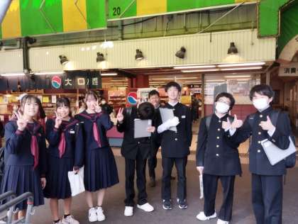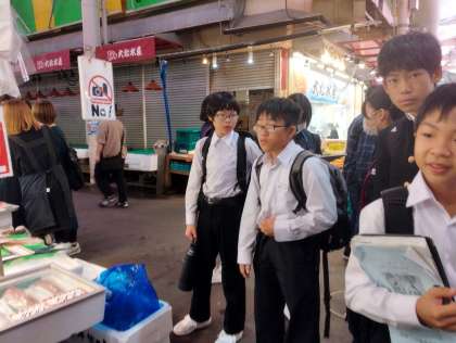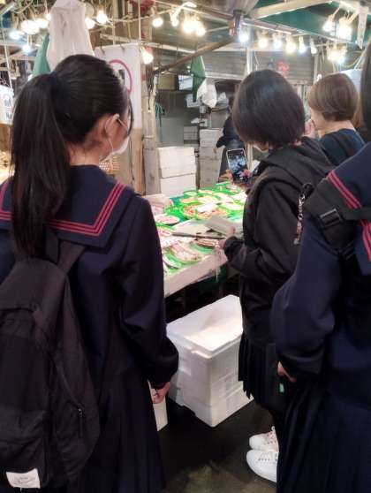 市場の様子を見学しています。このあと、4組の班は海鮮丼屋で昼食です。