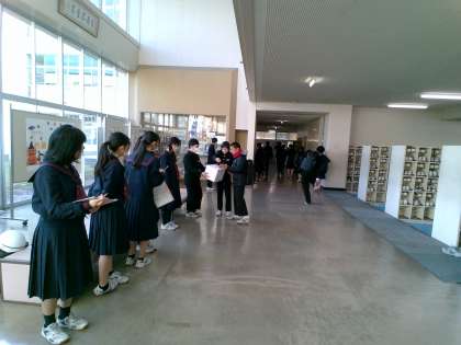 ボランティア実践部では、14日(火)から16日(木)まで、赤い羽根共同募金を実施しています。今日は2年生の実践部員が、朝、生徒玄関ホールに立ち、募金を呼びかけました。明日まで実施していますので、生徒の皆さん、保護者の方にも協力してもらい、募金へのご協力をお願いします。