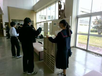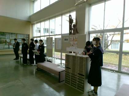 朝、生徒玄関ホールで1年生のボランティア実践部員やボランティアの生徒が声を出し、募金を呼び掛けていました。明日の朝は2年生が担当です。