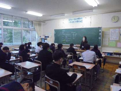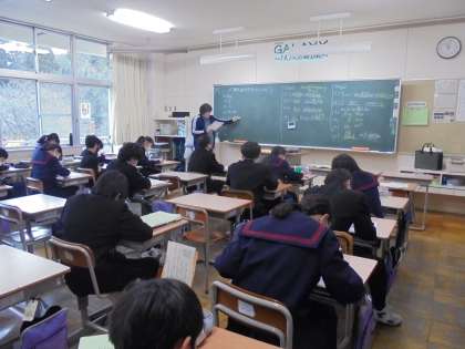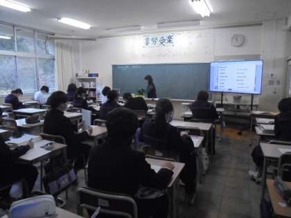 現在進行形についてのプリントに取り組み、その答え合わせと解説を聞いています。