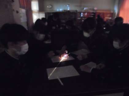 光はレンズを通り抜けると屈折する様子を、理科室を暗くして実験しています。
