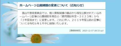「富山市教育委員会では、個人情報保護の観点から現在公開されているホームページ記事の公開期間を現在の「運用開始年度〜2023年」から「3年度前まで」に変更します。これに伴い、2019年度以前の記事については令和6年1月中に削除いたします。」