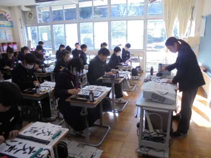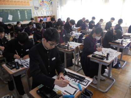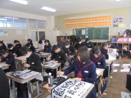今日は書初め大会がありました。3年生の課題は「国際交流」です。