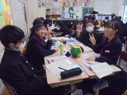 正多面体の模型を用いて、その特徴を調べようとしています。やはり、実物の模型があると立体をイメージしやすいのか、生徒たちも楽しそうです。
