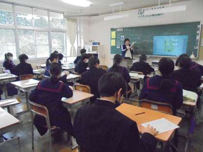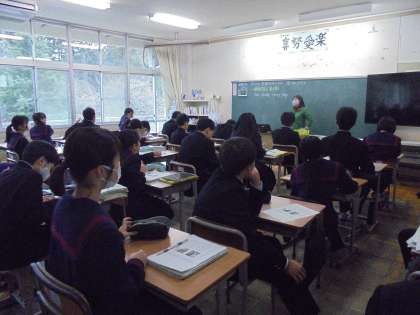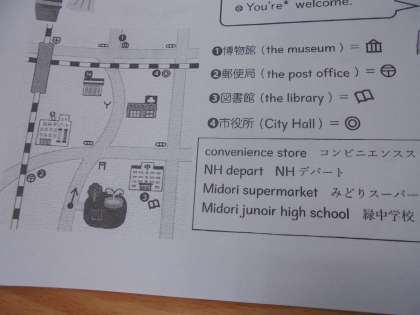 「Where is station?(駅はどこですか?)」等と尋ねられたらどう答えるかを練習しています。「go along」や「turn left」などを用いて一生懸命説明しています。