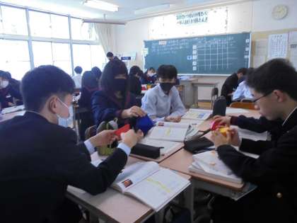 グループになり、正多面体の模型を観察しながら、発見した特徴を話し合っています。