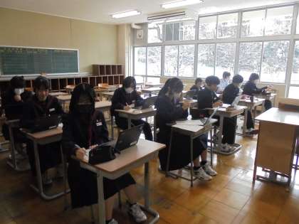写真下:15H 先週の講演会を欠席して聴くことができなかった生徒たちのために、講演会の録画を流しています。