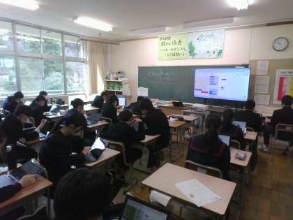 写真中:22H 技術 クロムブックを使って、プログラミングを学習しています。