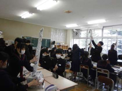 新聞紙を使って、どの班が一番高く積み上げられるかを競いました。班で工夫しながら協力して活動しました。