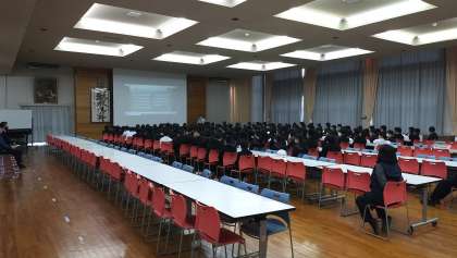 5限目は、ランチルームで交通安全教室を行いました。富山南警察署の署員の方から交通安全に関わるお話を聞いて、事故防止に対する意識を高めていました。その後外に出て、自転車通学生と徒歩通学生に分かれて、安全に登下校するための実地訓練を行いました。