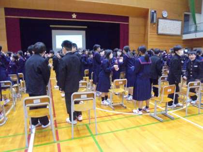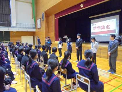 5限目に体育館で学年集会を行いました。学年の担当教員の紹介や中学校の1日の流れについての話を聞きました。