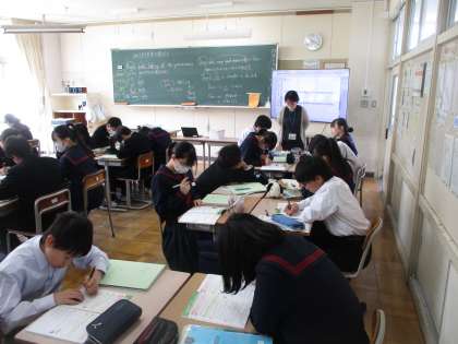 21H英語の授業の様子です。例文を参考にしながら、4人グループで問題に挑戦していました。