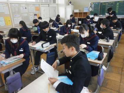 23Hの英語の授業の様子です。1年生で学習した基本文をペアでチェックし合っています。日本語から英語に直したり、発音を確認したり友達同士で学び合っていました。