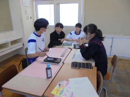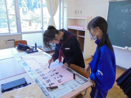 放課後、明日の学年集会に向けての準備を行っていました。先日、各クラスで話し合って決めた学級目標を清書していました。