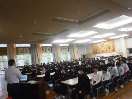学年集会では、2学年主任が、「社会に学ぶ『14歳の挑戦』」について話をしました。14歳の挑戦は、自分のよさや可能性を見つけるものであること、規範意識、社会性、働く意義を学び、生きる力を育むものであること等の大事な話がありました。
