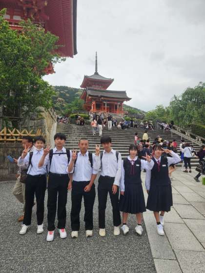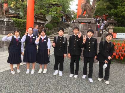 班で京都のまちを歩き、神社仏閣を見学している班別学習もそろそろ終末てす。大阪に移動する時間てなってきました。北陸道では土砂降りだった雨も、京都ではやみ、それほど暑くもなく、比較的過ごしやすい天候です。3年生の日頃の行いを見て、神様が晴れにしてくれたのかな。有難いですね。