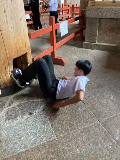 3組も柱の穴くぐりに挑戦しています。大仏さんの鼻の穴と同じ大きさだそうです。
