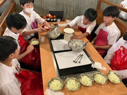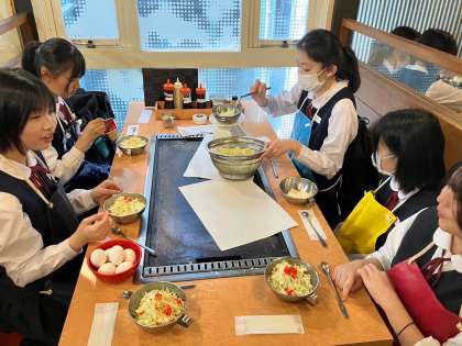 34Hは道頓堀の散策の後、お好み焼きを作っています。