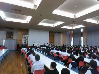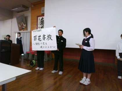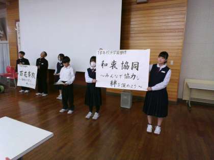 先日1学年全員にとったアンケートから、学年目標は「百花斉放(ひゃっかせいほう)〜個性の花を咲かせよう〜」、合わせて、校外学習目標は「和衷協同(わちゅうきょうどう)〜みんなで協力し絆を深めよう〜」に決定し、学年企画メンバーから発表をしました。